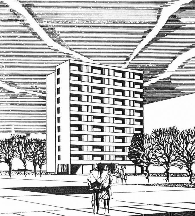 1965-ben az épület már épül, az akkori GYŐRITERV-es publikációs kiadvány így szól róla: