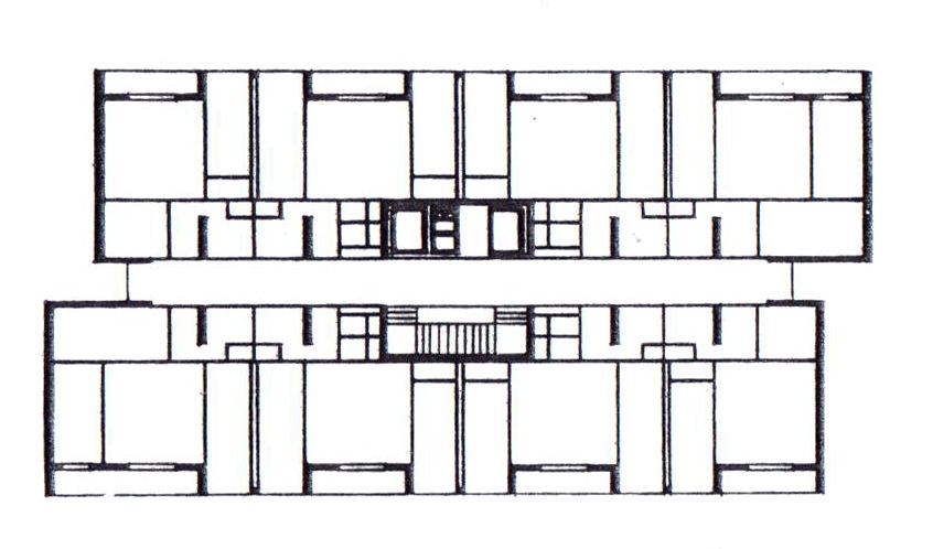 A pince + fszt. + 10 emeletes középmagas lakóépület középfolyosós rendszerű. A lépcsőház, a 2 db. 4 személyes lift, és a szemétledobó helyiség központosan helyezkedik el. A lépcsőház mesterséges, a középfolyosó két végén természetes megvilágítást kap. A lakások K-Ny-i tájolásúak. […] Az épület földszintjén részben a lakásokat kiszolgáló közös létesítmények – bejárati előcsarnok, közös gyermekkocsi és kerékpártároló, kukatároló és egy házfelügyelői lakás […] létesül. […] A tető felépítményében a liftek gépházát és a gépészeti igényeket kielégítő helyiségeket helyeztük el.