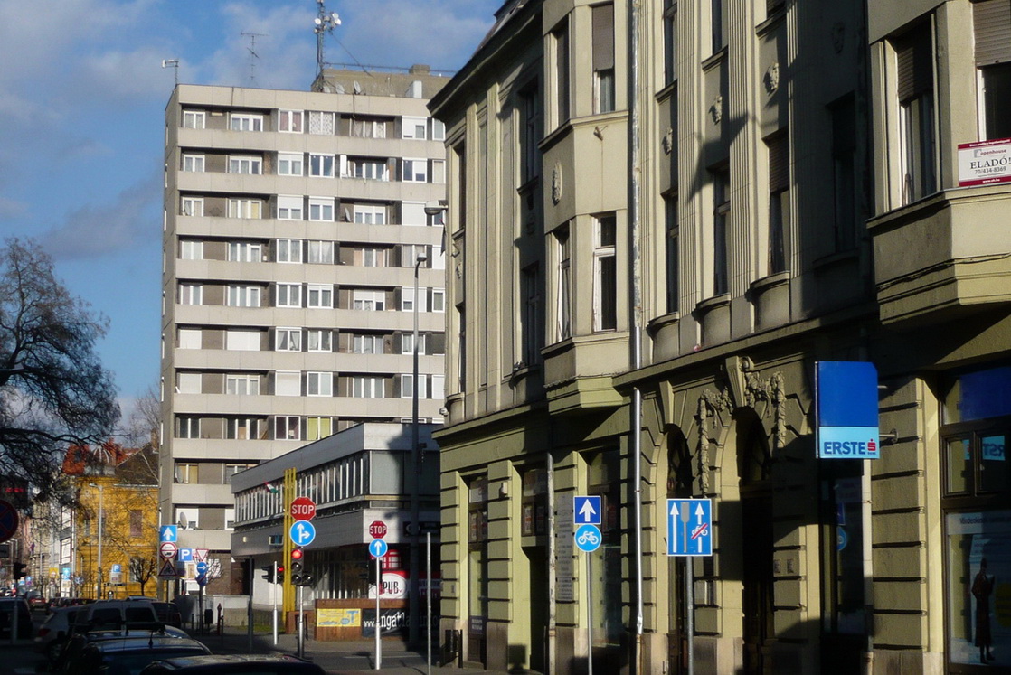 A belváros rekonstrukciója során létesült ez a középmagas épület, mely középfolyosós elrendezésben 81 lakást és a földszinten orvosi rendelőt tartalmaz. Monolit vasbetonvázas szerkezettel, nyersbeton felületekkel készült.