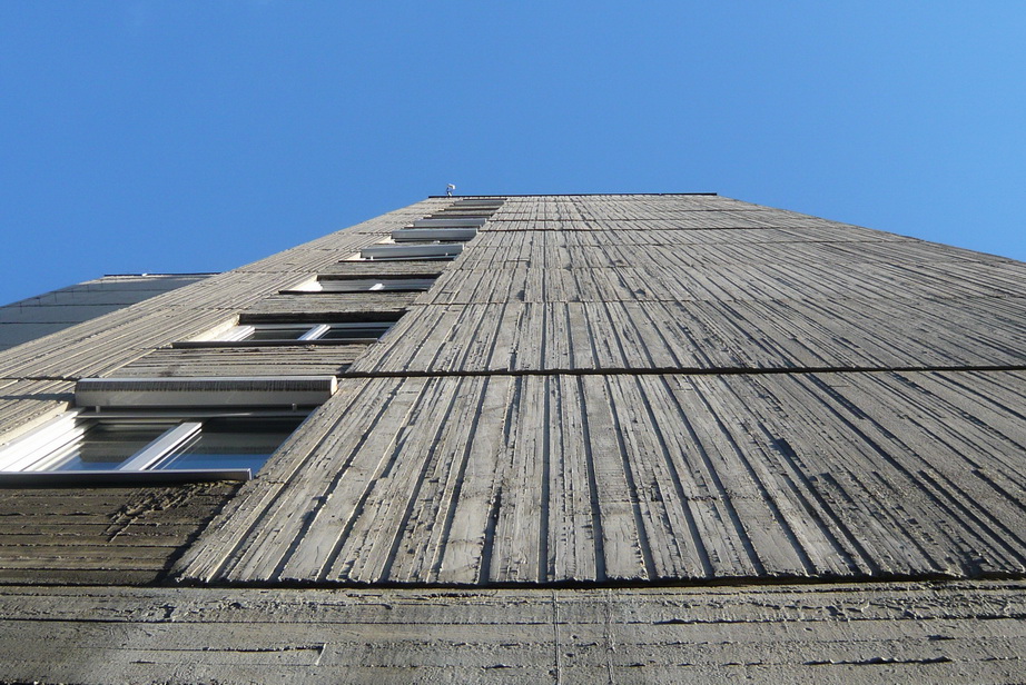 Az épület nyugati és keleti homlokzatán tervezett mellvédek előregyártott műkőből készülnek. A loggiák belső felületei vakoltak. Az ablakok közötti pillérek kőburkolatot kapnak. Az északi és déli végfalak nyer-beton felülettel készülnek, táblás zsaluzattal A földszinti pillérek szintén nyers-beton felületek. […] A földszinti és tetőemeleti falfelületek klinkertégla burkolatúak.