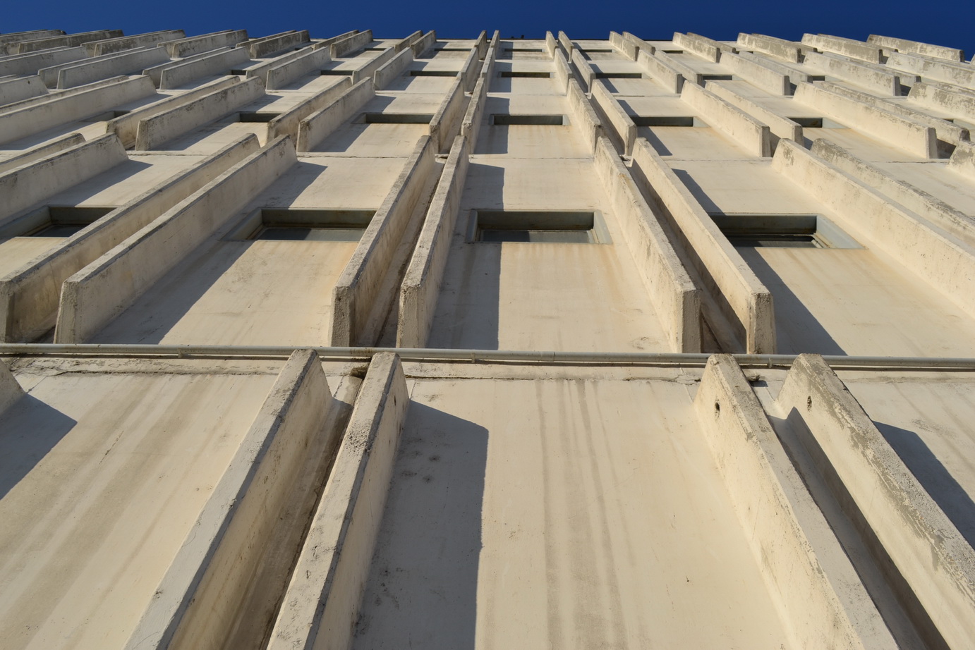 A homlokzat előregyártott szintmagas függesztett falpanelekből áll. A 31. Állami Építőipari Vállalat által kifejlesztett homlokzati panel-rendszer nagy népszerűségnek örvendett a korszakban. Több vidéki vállalat, köztük a Győri Közmű és Mélyépítő Vállalat is átvette és gyártotta ezeket az elemeket. A ház „kocka” formáját a lifttorony hangsúlyos jelenléte bontja meg. A nyersbeton felületképzéssel készült, nagyjából 3,5 m x 6,6 m alapterületű torony két hatalmas liftet rejt, amelyek az áruszállítást tették lehetővé – targoncák is kényelmesen elfértek benne. Ennek szerkezete monolit (helyszínen öntött) vasbeton. A deszkazsaluzat mintázata megjelenik a végső felületen is. Érdekes esetlegesség, hogy a lifttorony a tető fölé nyúló része kissé kiszélesedik, két oldalra mintegy 80–80 cm-rel. Itt található a liftgépház, valószínűleg több helyre volt szükség kialakításához és ezt egyszerűen így oldották meg. Az épület jelenleg használaton kívül van, újrahasznosításra vár.