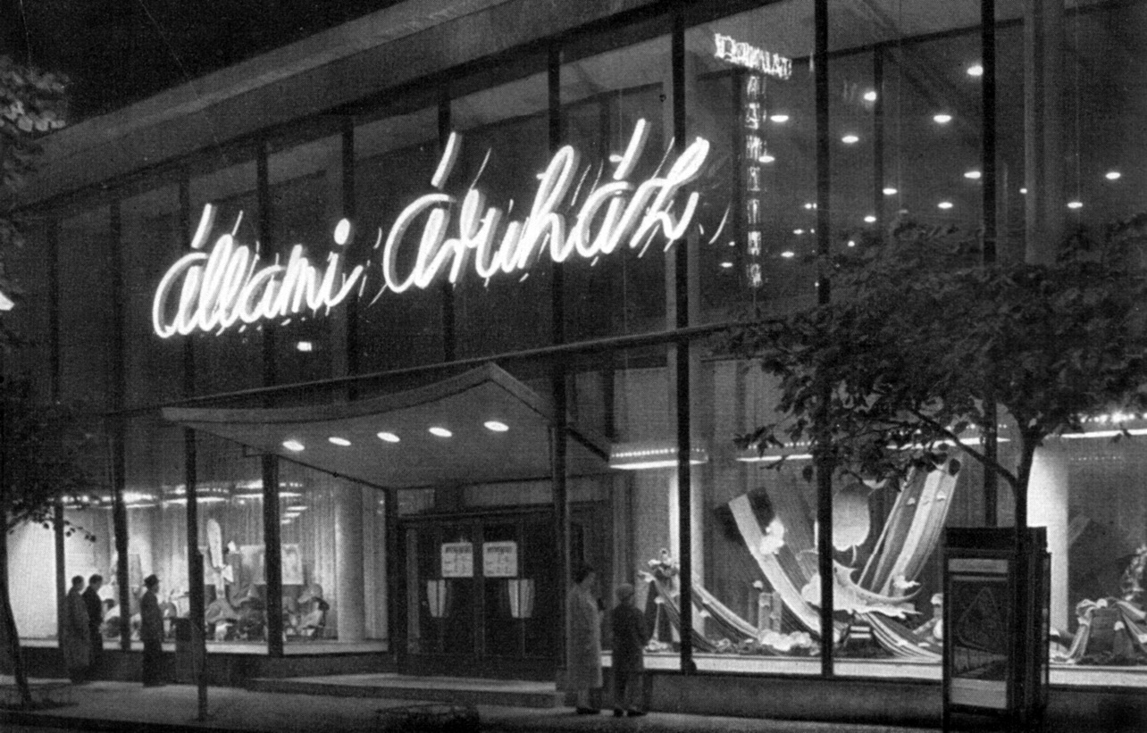 Győr első áruházát 1950 őszén nyitották meg. Az épület nem csak az első korszerű kereskedelmi létesítmény volt a városban, de a háború után átadott első épületek egyike is. Győr ezekben az években alig kapott támogatást az újjáépítéshez. Ez a ház volt az első állami “gesztus” a nyugati határszéli városban. Lapos teteje, teljes főhomlokzatát kitöltő üvegfelülete idegenül hatott a történeti belvárosában. Vass Antal 1956-ban Ybl-díjat nyert a tervéért.