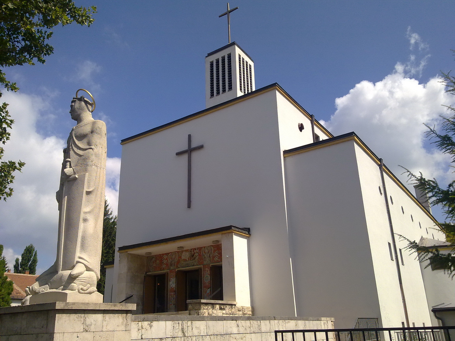 Szent Imre templom 2012. szeptember 1. Return to: Szent Imre templomFull resolution (1555 × 1166) Image navigation Previous Image Next Image Az előtérben a Szent Imrét ábrázoló szobor. Nagy a kontraszt a képzőművészeti alkotások és az épület formálása között. (fotó: HG)
