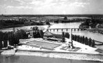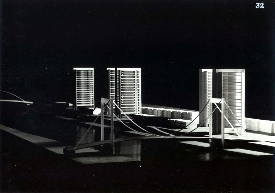 A fenti fotó előterében egy, a tízlábú átkelő helyére elképzelt, ambiciózus függőhidat látunk, a háttérben pedig a Győrt megkerülő tervezett úthálózat (máig el nem készült) északkeleti szektorának Duna-hídja tűnik fel.