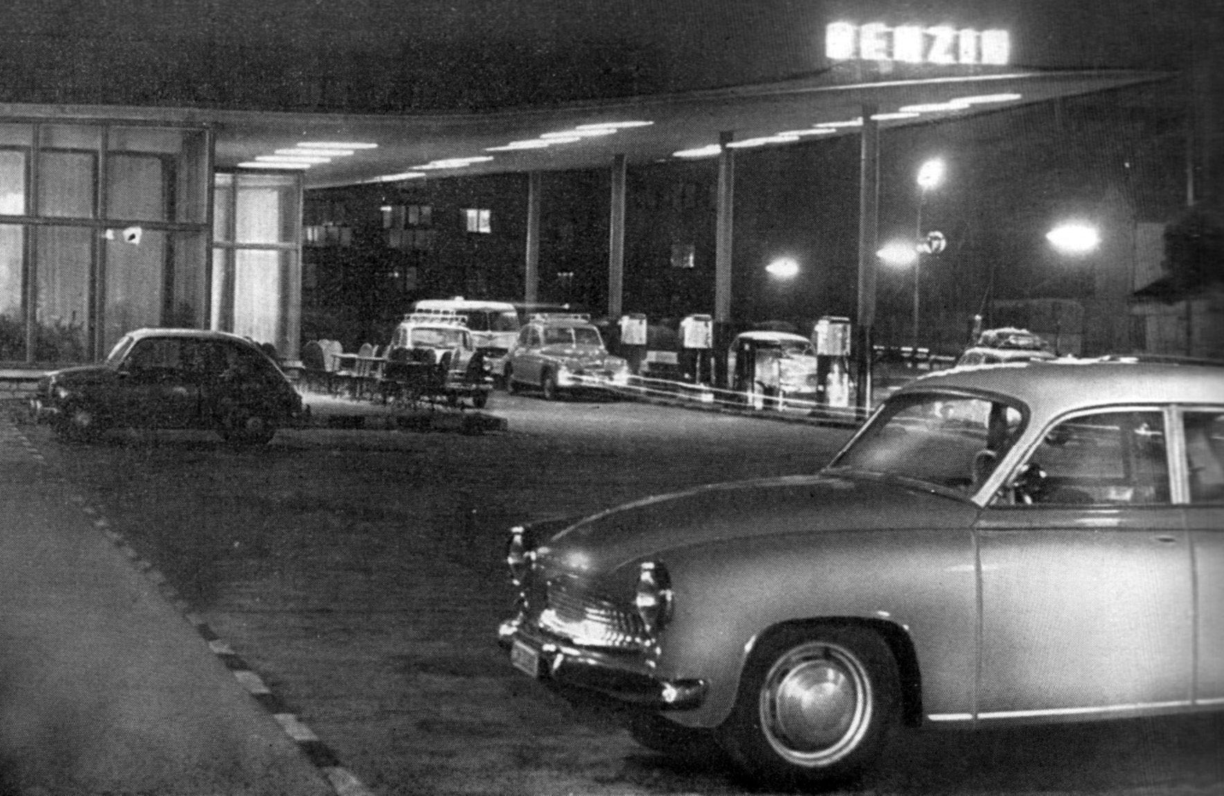 Győr egyik első benzinkútja a Bécs-Budapest főútvonal városon átmenő szakaszán kapott helyet. Vékony, elegáns ívű vasbeton födém fedte, az üvegfalú kiszolgálórészben volt a “motoros presszó”. Az eredeti épületet lebontották, helyén jelenleg is benzinkút üzemel.