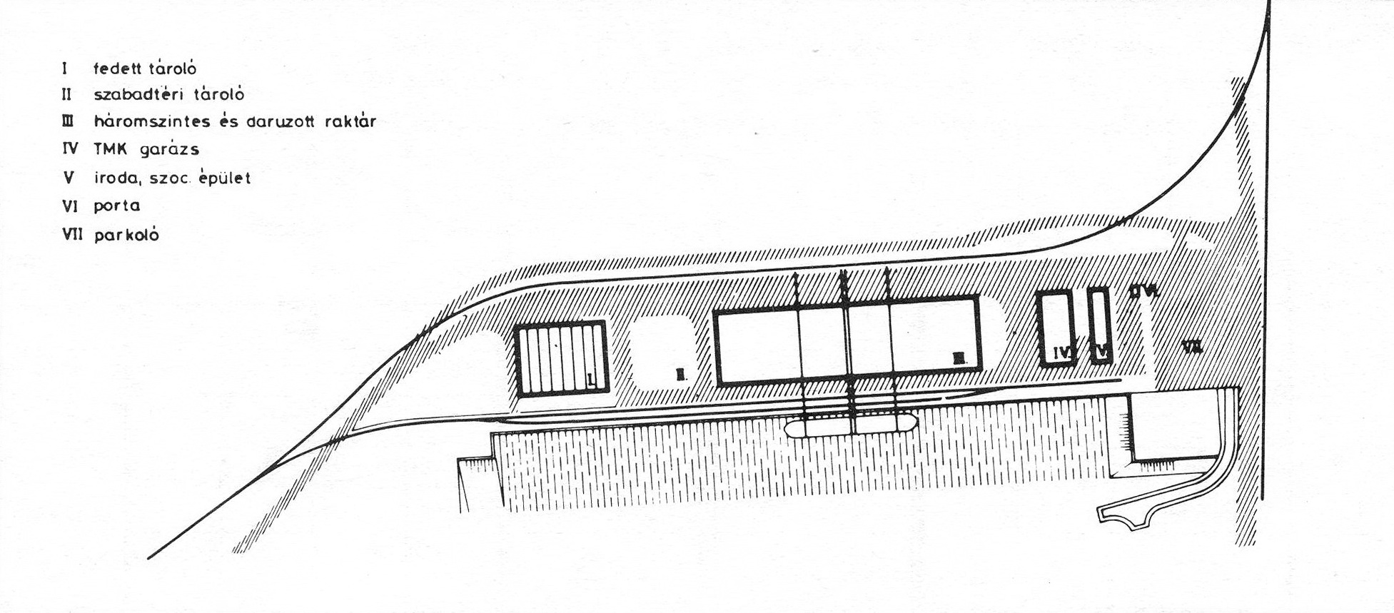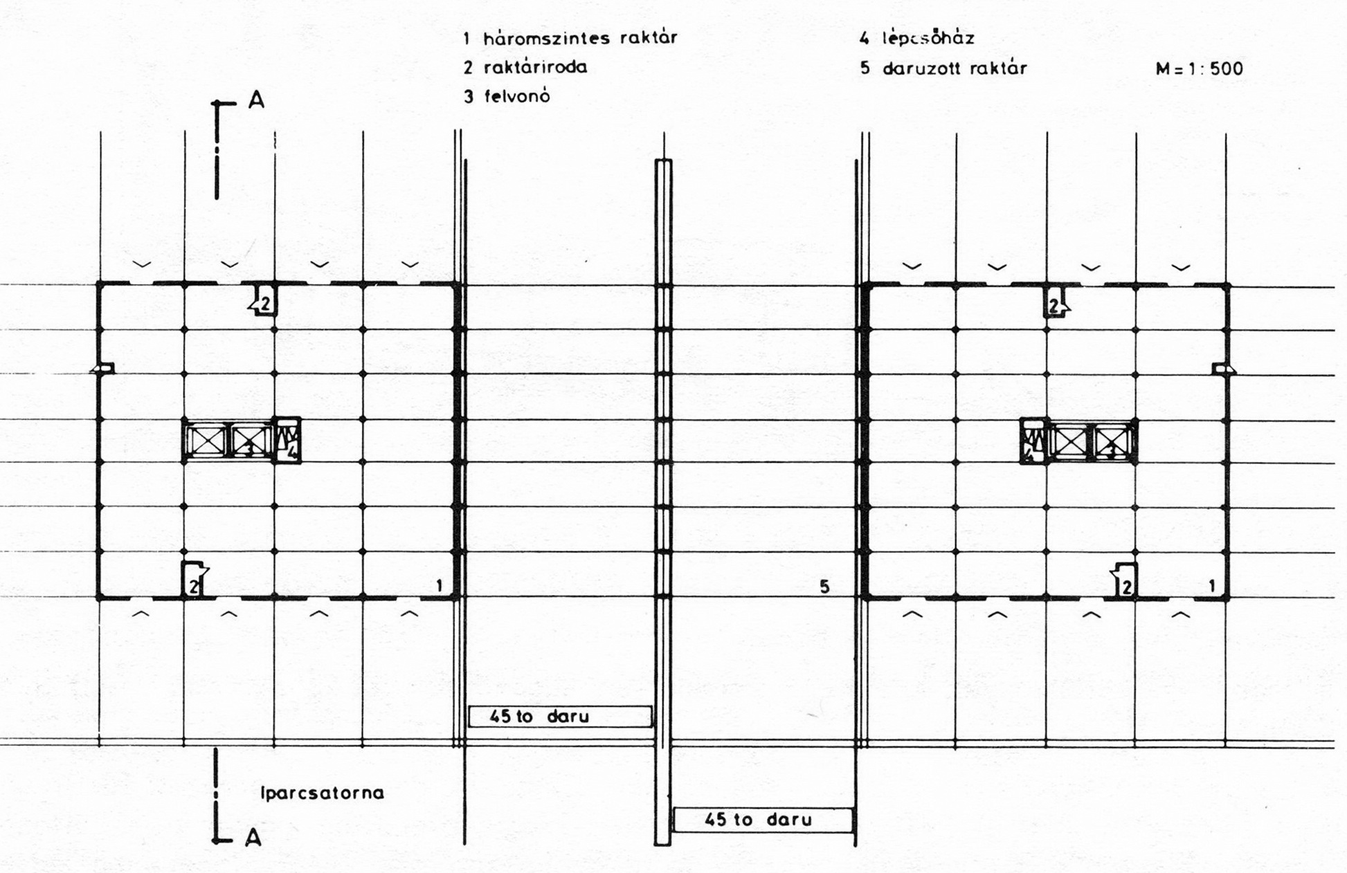 - Két, egyenként háromszintes raktárépület, a két épület között fedett, daruzott tárolótérrel