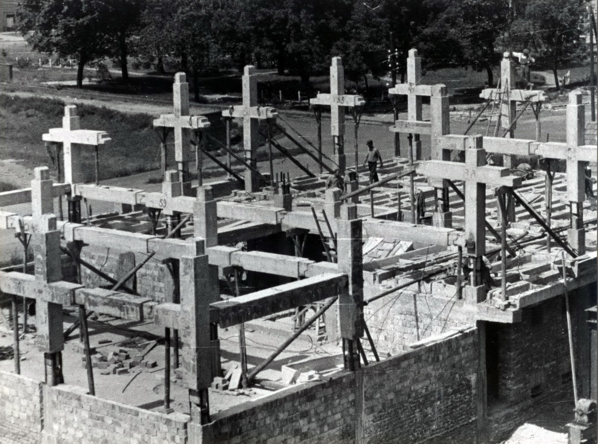 A fő teherhordó szerkezetek három nyílású, többszintes harántkeretek. A keret elemekre bontása az oszlop félmagasságában és a gerenda nyomatéki nullpontokban történik. A födémek előregyártott téglabetétes panelekkel készültek. Az épület merevítésében nagy szerepe van a vázkitöltő falazatoknak, a belső lépcsőháznak és a liftaknának. A nagyfokú előregyártás miatt a vázszerkezet felépítése szerelő jelleggel készült. Hegesztett kötések készültek, a súlyhatárt az emelőszerkezet teherbírása szabta meg. Szerkezettervezője Filippovits Ferenc. [1]