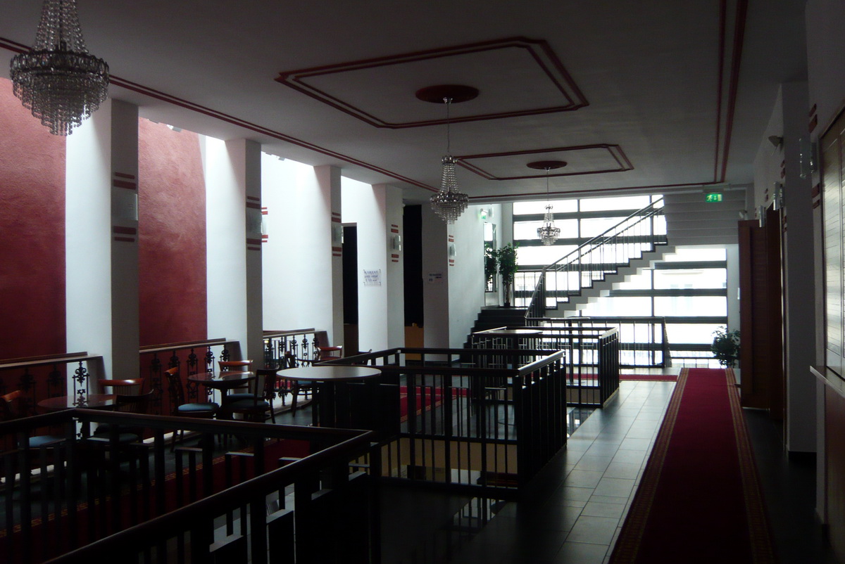 Kultúrház 2013. február 15. Return to: Kultúrház (Bartók Béla Művelődési Központ)Full resolution (1200 × 802) Image navigation Previous Image A felújított kultúrház emeleti előtere. A bal oldali piros íves tömeg a színházterem hátsó fala. (fotó: HG)