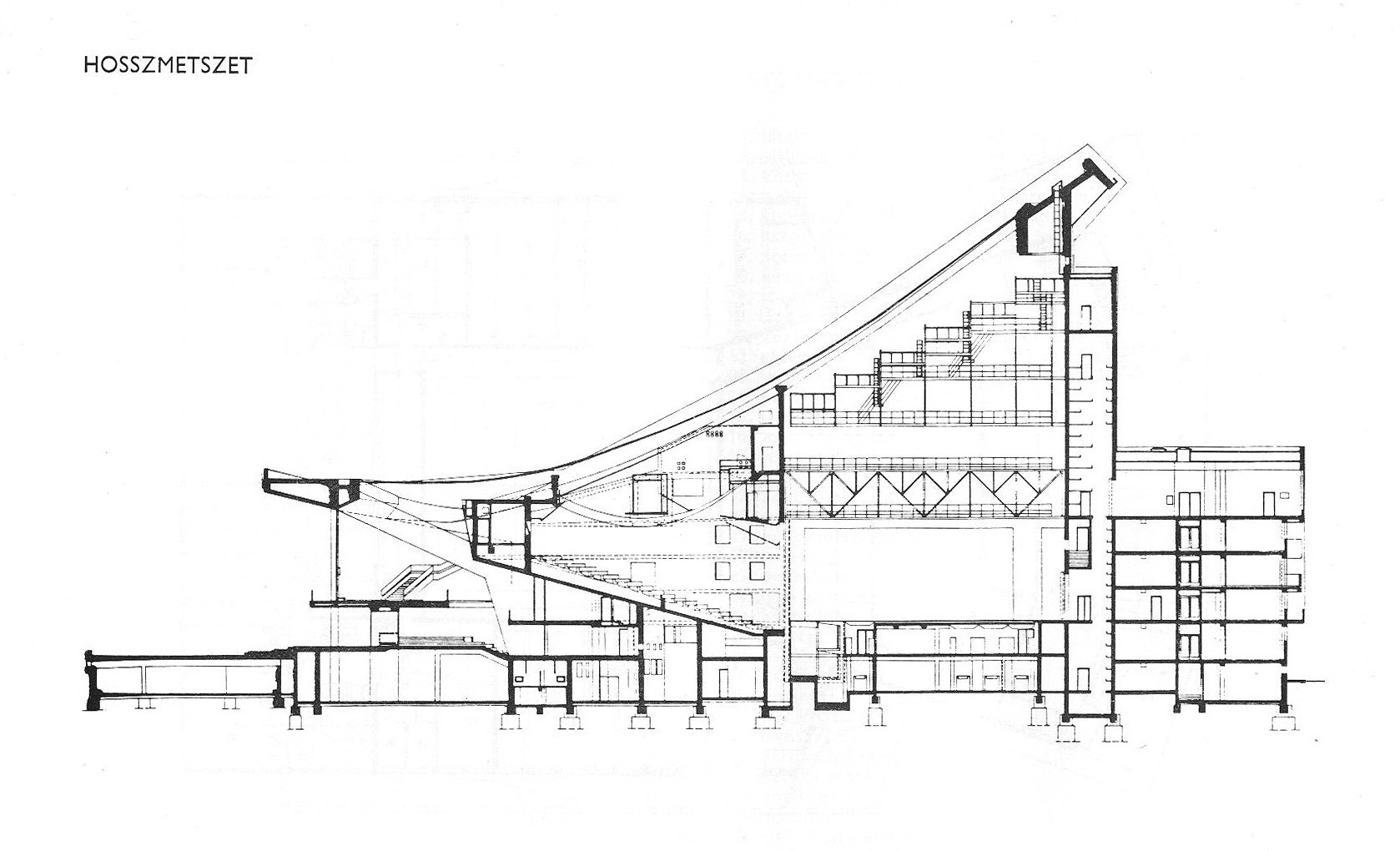 Az épület tömegét azonban kezdetektől a nagyfesztávú terek lefedése és a zsinórpadlás kialakításának kérdése befolyásolta leginkább. Az első elképzelések egy lapostetős változatot vizionáltak toronyszerűen kiemelkedő zsinórpadlással. Azzal együtt, hogy ezt a változatot az építészek is túl “otrombának” tartották, végül az anyagi szükségből fakadó “találékonyság” vezetett az új és végső megoldáshoz. Érdemes a történetet Harmati János építésztől idéznünk: