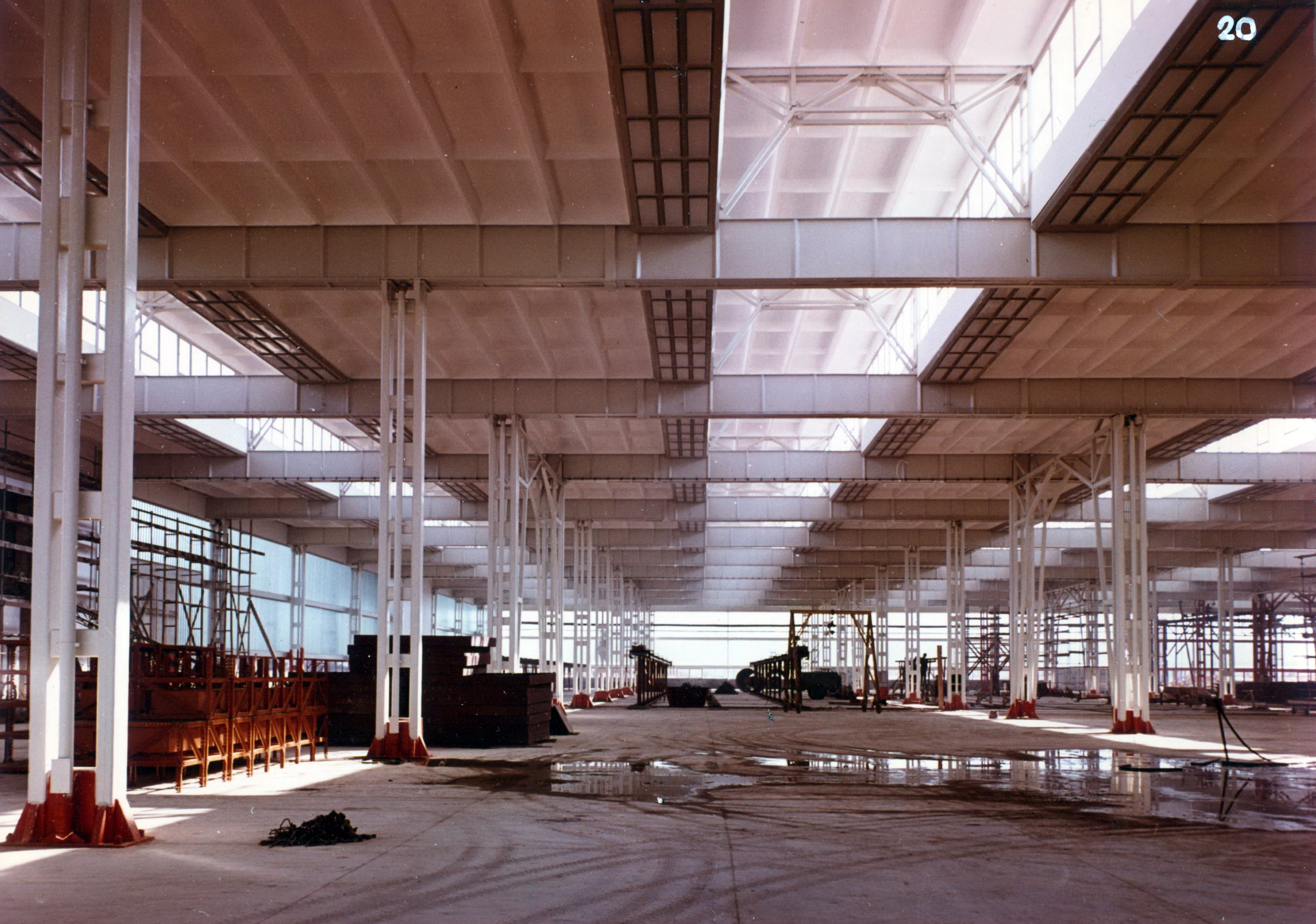 A csarnokok 12×18 m-es raszterben épültek. A fő teherhordó konstrukció oszlopai Vierendeel-rendszerűek, a szaruzat kettőzött Gerber-tartókból áll. A szerkezet hidegen hajlított szelvényekből hegesztett zártszelvényekből áll. A két ‘I’ acélból összerakatott gerendák merevítő diafragmái kívül helyezkednek el, mivel egyúttal légcsatornaként (max. +45°C) is működnek. A kivitelezés és gyártás gazdaságosabbá tétele miatt a gerbertartók csuklóinak helyét úgy választották meg, hogy a mértékadó szélső- és közbenső nyomatéki maximumok közel azonosak legyenek, így azonos keresztmetszet alkalmazható a lehető leggazdaságosabb kihasználtsággal.