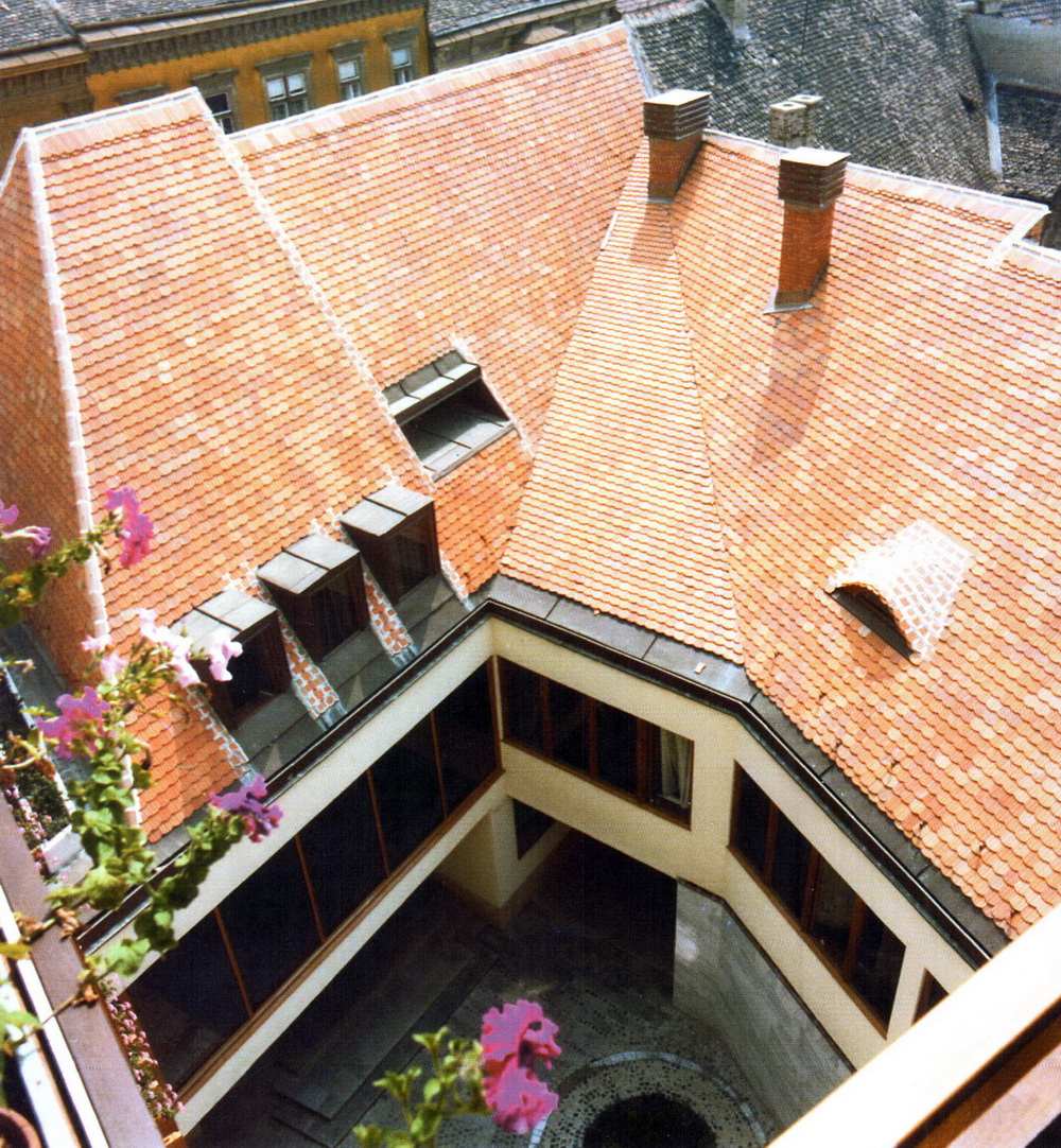 Az épületet egy átjárható belső udvar köré szerveződik, amelyen keresztül még a szomszéd ház udvara is megközelíthető. Itt a fedett-nyitott és külső-belső terek egymásba fonódása is fontossá válik. A történeti belvárosról való gondolkodás megváltozásának ez is beszédes jele: az egyes épületekben való gondolkodást felváltotta a városi léptékben, terekben, tömbökben való gondolkodás.