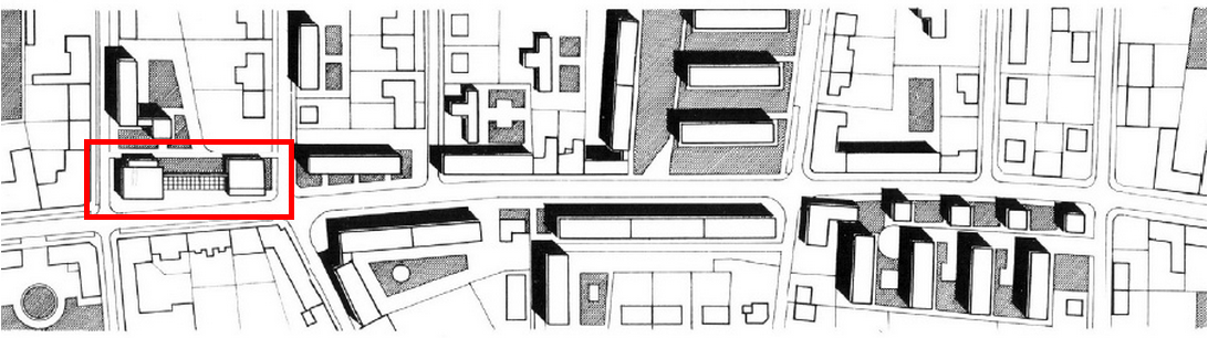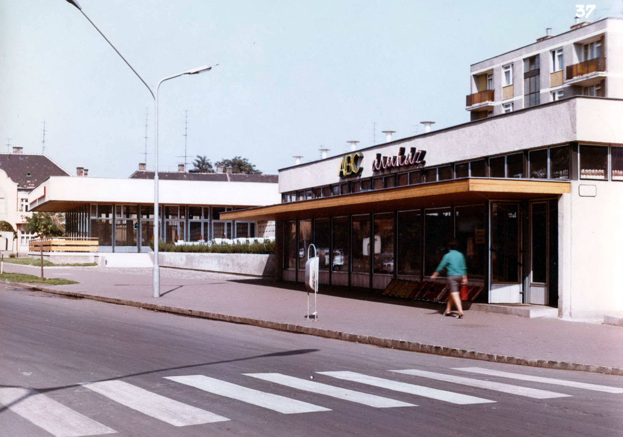 Egybeszerkesztett, de mégis két különálló épületről van szó, amelyeket a vendéglő támfallal szegélyezett terasza köt össze. Az étterem és terasza az utca szintjétől elemelkedik, így kis távolságot vesz a köztéren zajló élettől. Az ABC bejárata a járdával egy szintben nyílik. A két rész szerkesztése nagyon hasonló. A hátsó, zártabb traktusban a kiszolgáló helyiségek (konyha, ill. raktár) kaptak helyet, míg az utcafronton az étteremben a fogyasztó-, az áruházban az eladótér található. Ennek megfelelően a zárt és nyitott falfelületek is tiszta rendszert képeznek: főleg az étterem architektúrája épül a filigrán üvegszerkezet és a felette lévő nehézkes vasbetonfödém feszültségére. A talán túl rideg anyaghasználatot az étterem fa korlátja és a bolt fa keretezésű előteteje volt hivatott talán talán tompítani, de ezek legalább annyira érződnek erőltetett rátett elemnek, mint a barátságosság jelének.