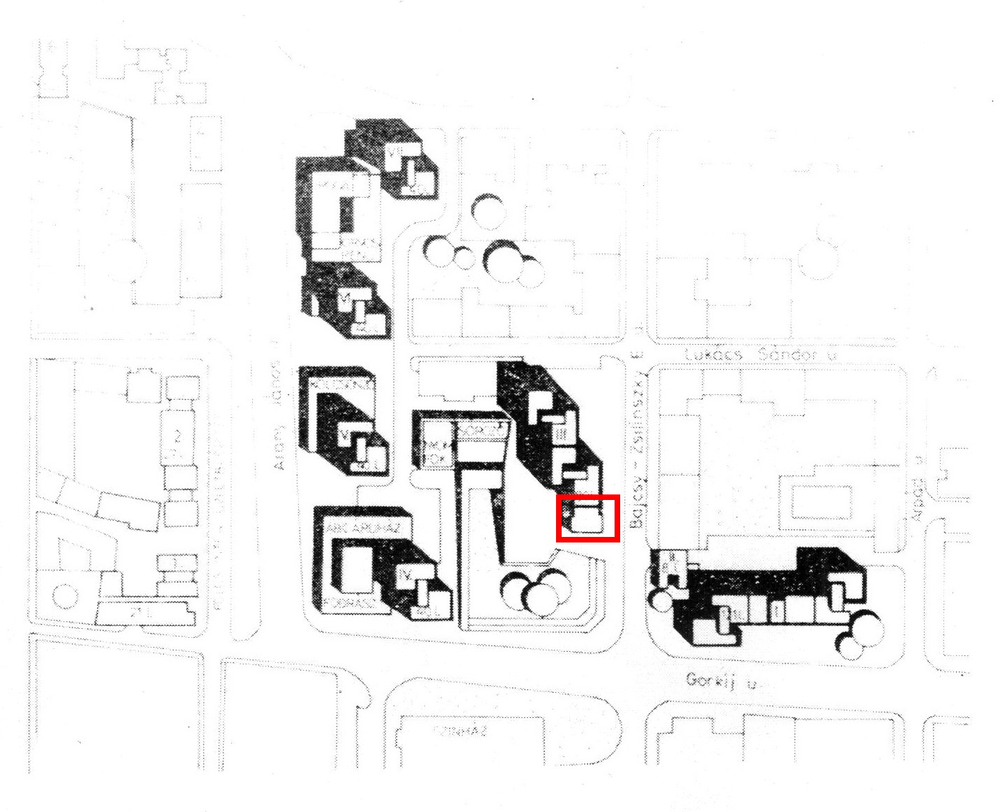 A Teleki (Gorkij) utcai lakótelepi beépítés egyik kis szolgáltatóépülete. A belváros szomszédságában épült lakótelep tízemeletes panelházai “dupla”, azaz másfél emelet magas monolit vasbeton szerelőszinttel készültek, hogy az így felszabadított és nagyobb belmagasságú földszinti épületrészt ki lehessen használni üzletek, és egyéb kapcsolódó kiszolgálóépületek elhelyezésére.