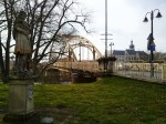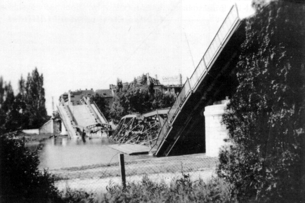 1945-ben ez a híd sem kerülhette el sorsát, felrobbantották a visszavonuló csapatok. A roncsok kiemelése nem ment könnyen. Először egy itt hagyott német uszályról próbálták meg lehetőleg “egy darabban” kimenteni a híd épen maradt részét, de ez nem sikerült. Végül búvárok robbantásokkal az iszapból kiszabadították és kettéválasztották a szerkezetet, amelyet 1947 végére sikerült kiemelni.
