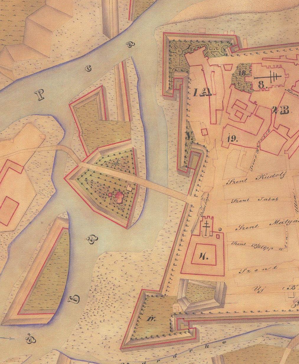 A híd akkor vált “kettőssé”, amikor 17. század közepén egy újabb nagyszabású török támadástól tartva, a várat kiegészítették azokkal a külső erődítményekkel, amelyek megépítését már a 16. században is tervezték. Több mint húsz mesterséges sziget épült külső védműként, amelyek úgy vették körül a várat, mint a sündisznót a tüskéi. Ezek egyike a mai Radó-sziget is, amelyen át a bécsi utat vezették, ahogyan az alábbi metszeten is látható. (Az erődítés egyébként annyira jól sikerült, hogy a török felmérve saját és a vár erejét, egyszerűen elment mellette tovább, Bécs felé.)