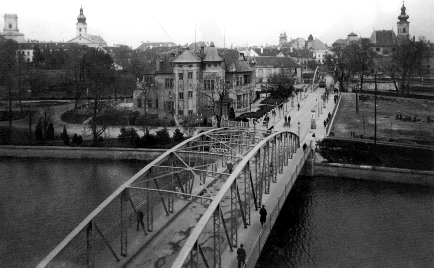Az alábbi képen nagyon jól látszanak a két híd íves szerkezetei, amelyek új elemmel gazdagították a városképet. Középütt látjuk a “Kioszk” épületét is, amely a 20. század elején épült a szigeten, a győri társasági élet központja volt. A régi színházépületet helye (bal oldal) ekkorra már üres, lebontották.