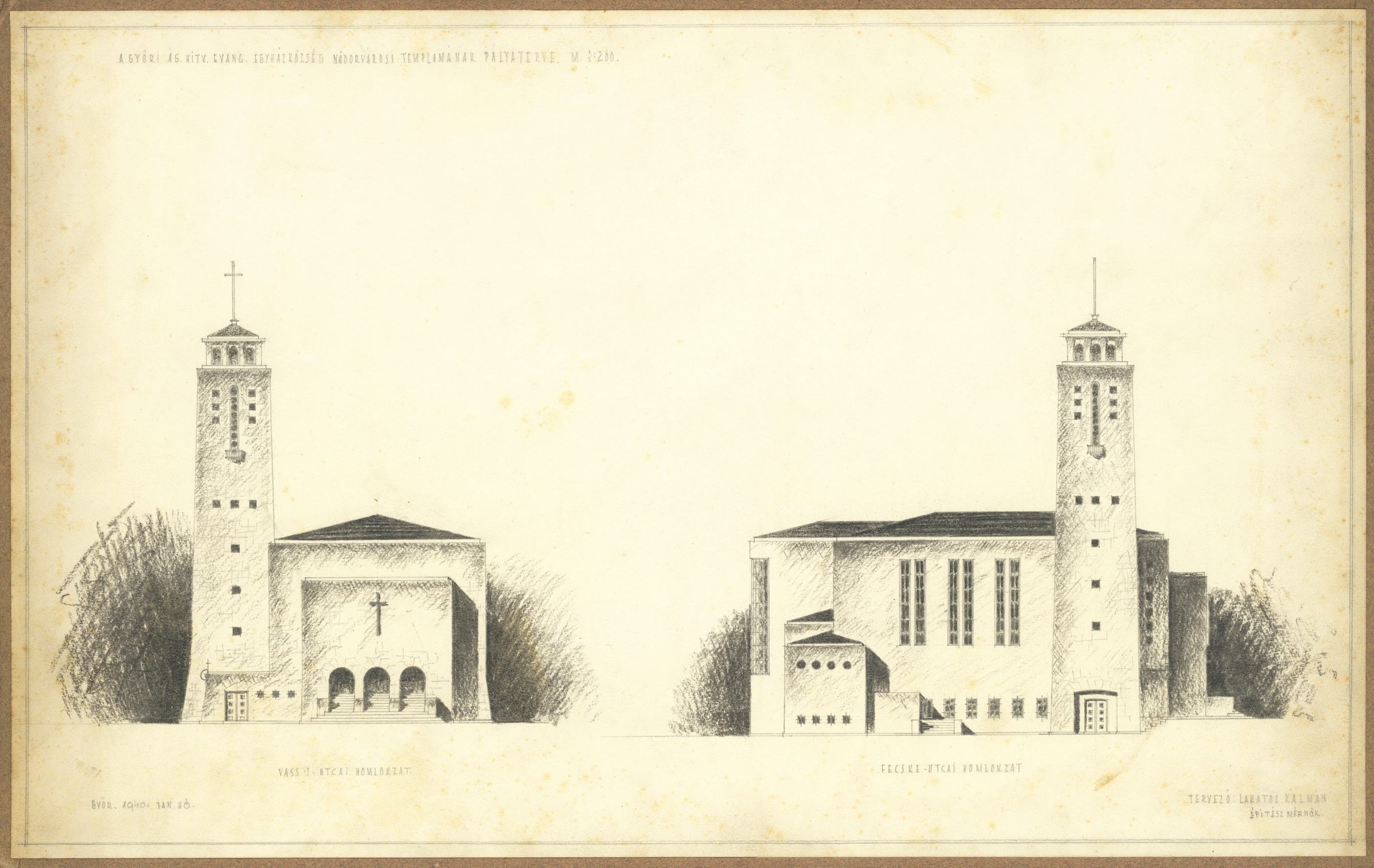 Győr-Nádorvárosi Evangélikus Templom, tervpályázatok 2016. március 5. Return to: Nádorvárosi evangélikus templomFull resolution (2810 × 1776) Image navigation Previous Image Next Image Az evangélikus egyházközösség nádorvárosi templomának terve, homlokzatok. Lakatos Kálmán, 1940. (forrás: © Ráth Mátyás Evangélikus Gyűjtemény, Győr)